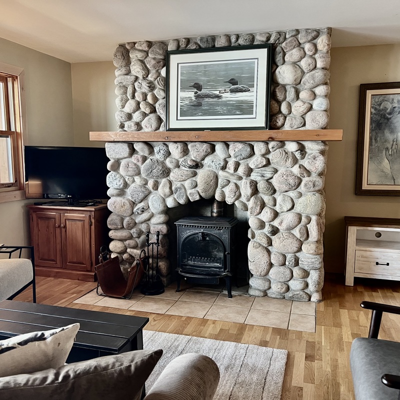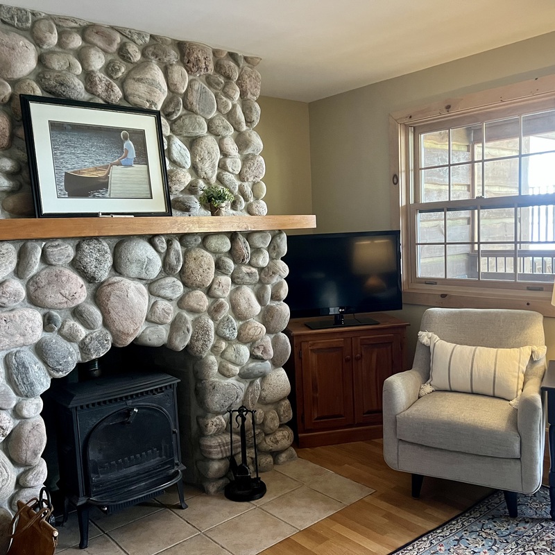 With our exceptional location overlooking Stoney Lake, our 'Lower East Suite, a one bedroom lakefront suite, features a cozy living room with an impressive brook-stone wood-burning fireplace, attractive furnishings, and extends to an open concept kitchen area. Sliding glass doors from the living room open to a charming, private, screened-in lakeside balcony/deck, with patio furniture, a beautiful lake view and stunning sunsets!