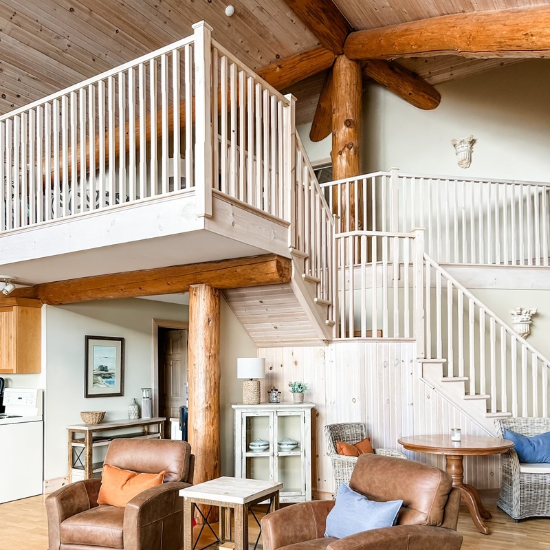 Directly overlooking Stoney Lake, our cozy two-bedroom lakeside suite features a welcoming living room with comfortable furnishings and impressive wood burning brook-stone fireplace, and extends to kitchen/dining area. Sliding glass doors from the living room open to a private, lakeside balcony with patio furniture, and an outstanding lake view. The master bedroom has a king bed, and is on the main floor of the suite. A four-piece bath with deep soaking tub and walk-in shower, is beside the bedroom. The second bedroom is upstairs and has a long double and single bed and a three-piece bathroom with walk-in shower.