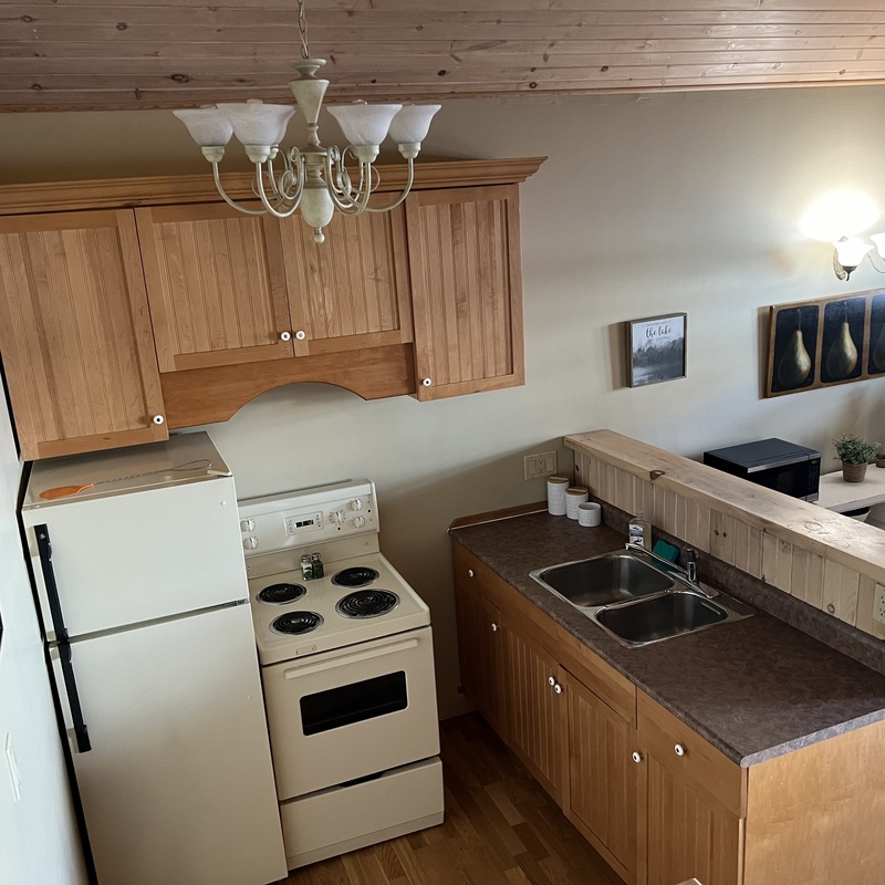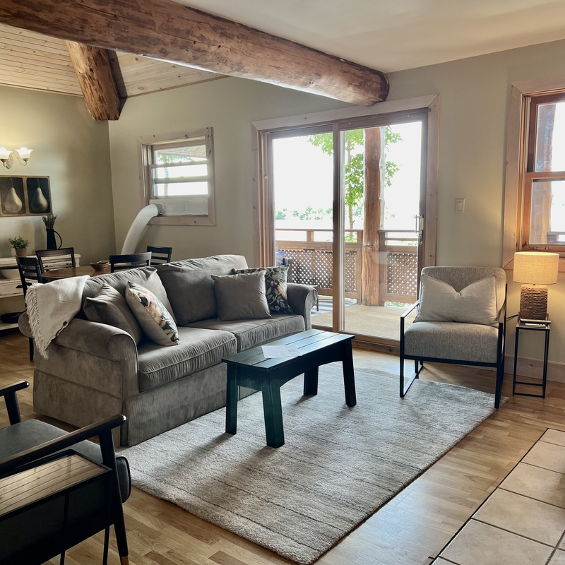 Directly overlooking Stoney Lake, our lovely two-bedroom lakeside suite features a charming living room with modern furnishings, a stunning wood burning brook-stone fireplace, extending to an open-concept kitchen area. Sliding glass doors from the living room open to a private, screened-in, lakeside balcony/deck with patio furniture, and an incredibly beautiful lake view. The master bedroom is on the main floor and has a king bed. A four-piece bath with deep soaking tub and walk-in shower, is beside the bedroom. The second bedroom is upstairs and has a long double and a single bed and a three-piece bathroom with walk-in shower.