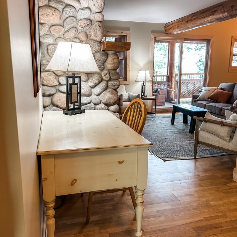 With our enviable location overlooking Upper Stoney Lake, this gorgeous, spacious two-bedroom, two bathroom lakeside suite features an impressive, wood cathedral ceiling, beautiful custom furnishings and remarkable stonework in the grand, custom, brook-stone fireplace. Enjoy a cozy wood burning fire, and a panoramic lakeside balcony/deck with a pristine sunset view.