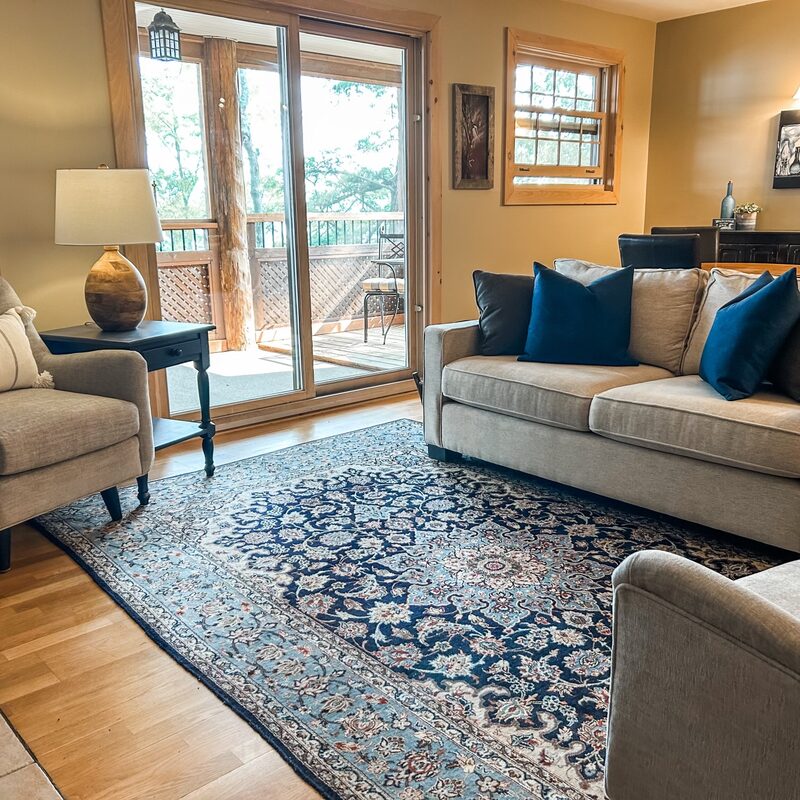 With a stunning cathedral ceiling, the spacious living room has lovely, contemporary furnishings, an antique Persian carpet, and extends to an open-concept kitchen area. Sliding glass doors from the living room open to a private lakefront balcony/deck with an outdoor eating area, patio furniture, and an incredibly beautiful lake view, featuring stunning sunsets.